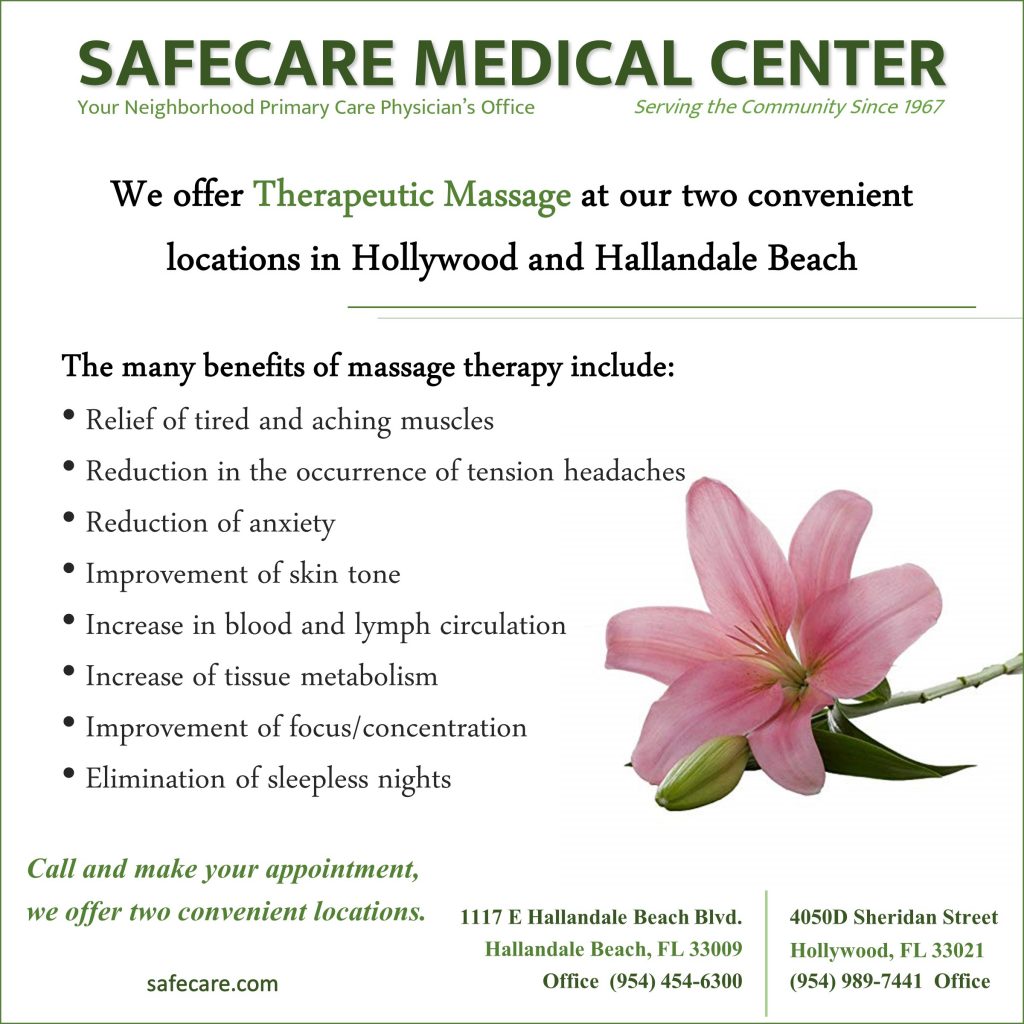 Call today to make an appointment and receive the many benefits and improvements in your health that massage therapy can offer. Gift certificates for massage therapy are also available. Hallandale office 954-454-6300. Hollywood office 954-989-7441.